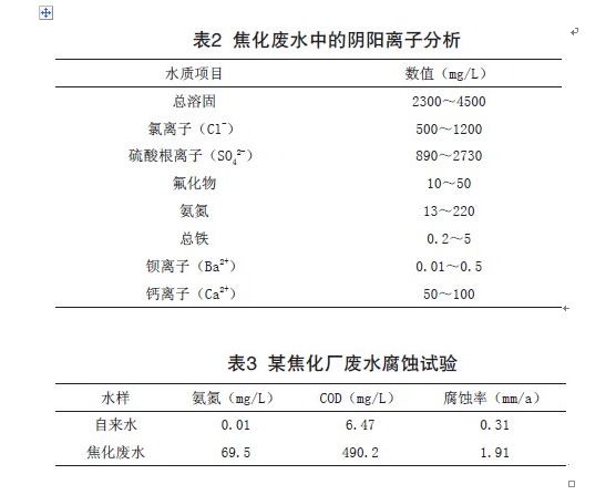 (2)设备及管道腐蚀:焦化废水具有较强的腐蚀性。从调研实测的相关资料中可以看出(见表2、表3),废水中的氯离子、氟化物、氨氮以及硫酸根离子浓度较高,对金属腐蚀性较强。因此,焦化废水的腐蚀问题必须得到妥善解决。