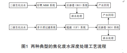 单纯生产焦炭的企业没有联合型钢企所具有的消纳途径,因此很多焦化厂不得不采用反渗透技术将焦化废水进行浓缩,产品水水质较好,可以直接作为工业循环冷却水的补水,产生的浓水则作为抑尘水或伴煤燃烧。图1是两种典型的反渗透处理工艺。