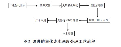 根据前面的介绍,电化学氧化、催化氧化技术的工业化应用较少,基本都停留在试验研究阶段。大型臭氧设备在自来水厂作为消毒技术的应用较多,作为氧化技术在工程上的应用则较少,但是与其它高级氧化技术相比,设备相对成熟,国产化程度也较高,因此工程化的优势相对较大。改进的焦化废水深度处理工艺见图2。
