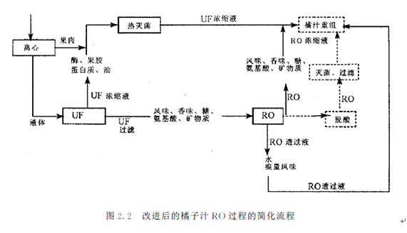 用膜生产无菌浓缩橘子汁的工业过程如图2.2。该过程改善了橘子汁的风味,减少了酸度。在生产过程中含风味、酸和糖等小分子物的热敏性溶液被反渗透冷浓缩#易变的组分没有明显损失。非热敏部分经冷态或热态浓缩而无风味化合物的损失,或形成糖蛋白`棕黄产物。最后果肉和浓缩的非热敏性溶液用刮板式表面热交换器进行热灭菌,然后充入冷浓缩液,热敏性部分在无菌条件下混合,生产出浓缩的或灭菌的果汁。